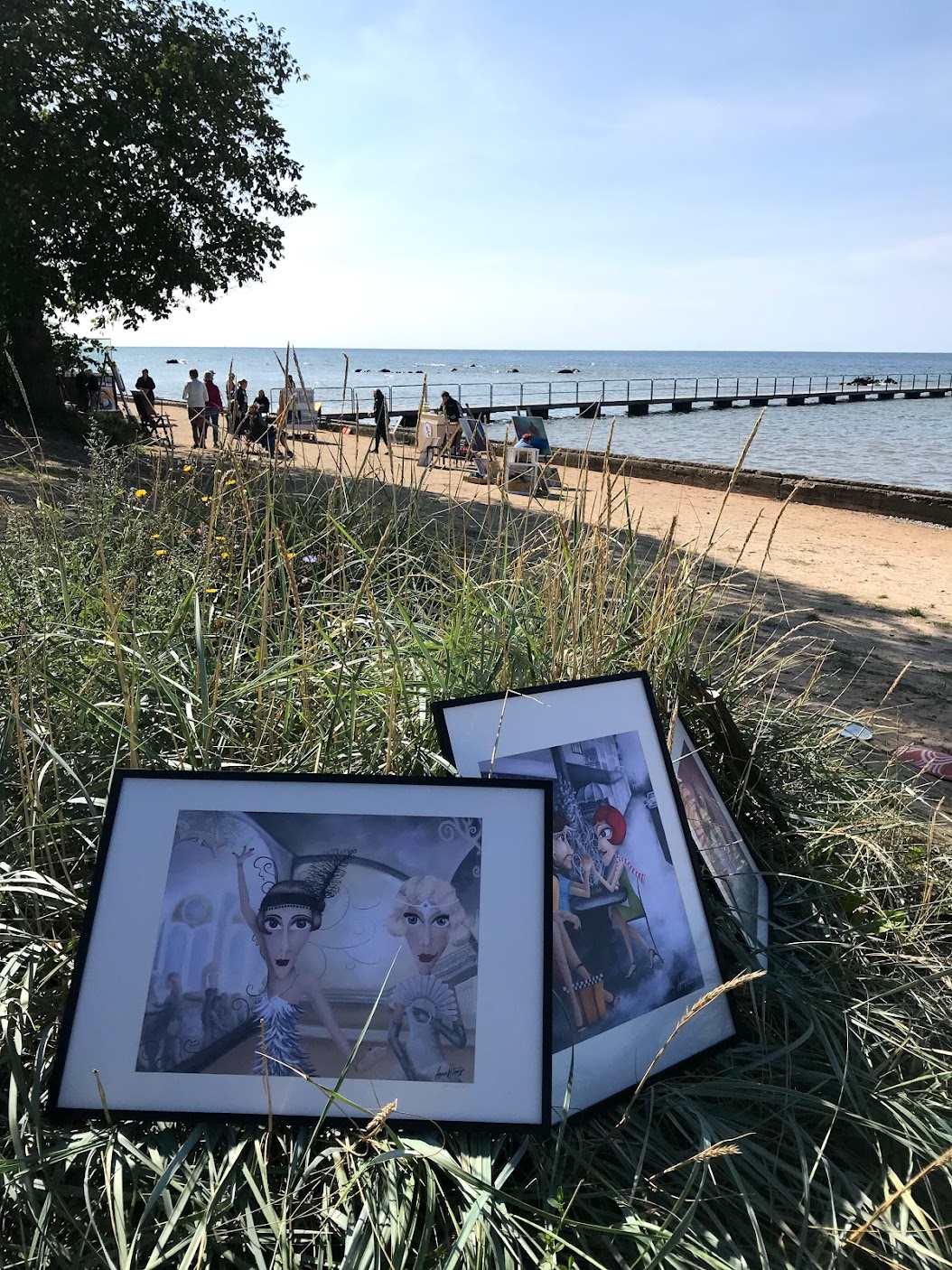 Utställningen drog igång klockan 10 i strålande sol och ganska kraftig vind – vilket gjorde att kreativiteten fick ta plats även i själva presentationen. Konst i gräset, på sanden, på restaurangväggar eller på egenhändigt byggda ställningar. Det var en härlig blandning och ett fint sätt att se konsten möta platsen.